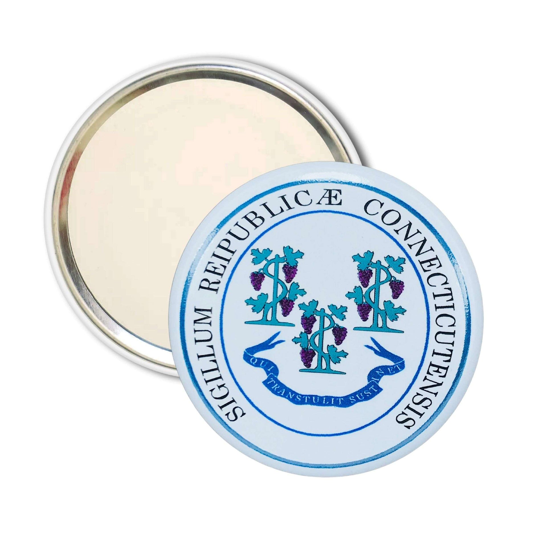 The official coat of arms of the state of Connecticut is a symbol that encapsulates centuries of history and the values that define its people. Featuring three vines representing the earliest settlements and the famous Latin motto “Qui Transtulit Sustinet” (“Whoever Transplants, Sustains”), this emblem is a powerful reminder of the perseverance, strength, and faith that have characterized this state since its founding. Incorporating this coat of arms into a portable mirror carries with it a legacy of courage and unity, a literal and figurative reflection of Connecticut’s identity.