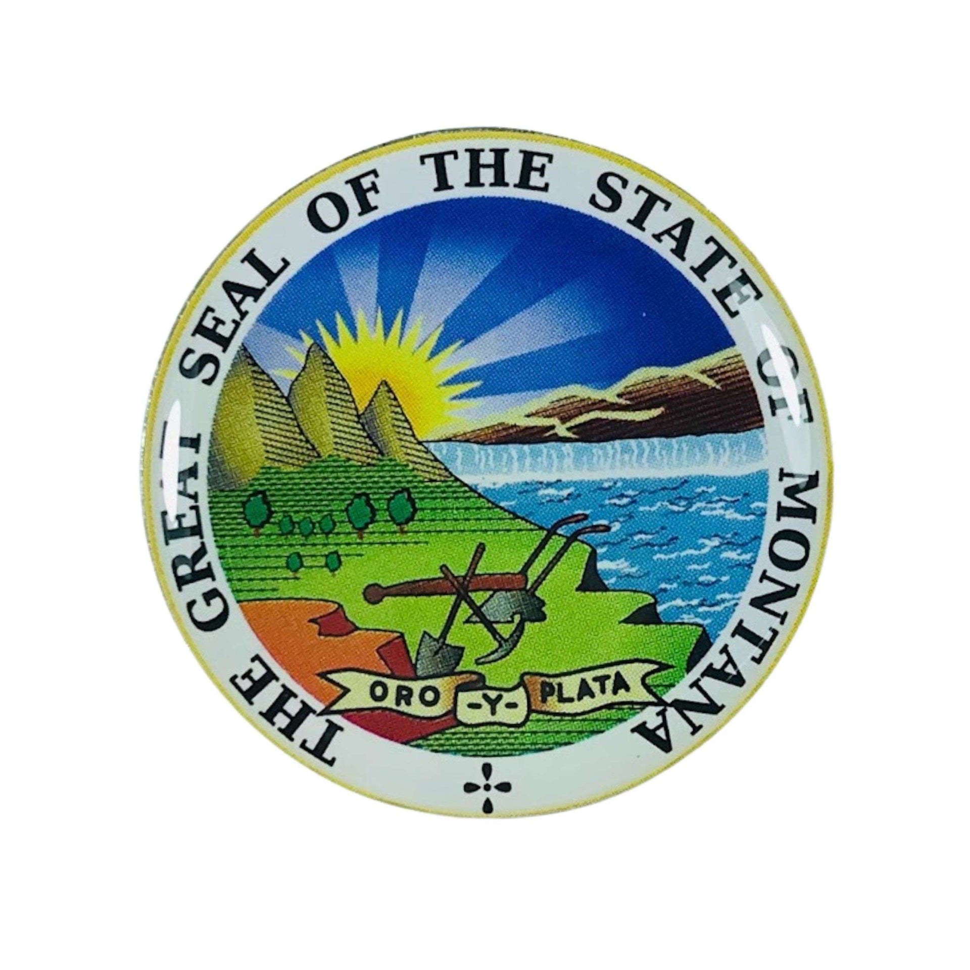 The shield this pin represents is much more than a graphic design. It's a symbol that brings together Montana's history, pride, and identity. At the center, elements such as a mountain peak, symbolizing the imposing Rocky Mountain range, stand out; a rising sun, representing hope and new beginnings; and tools that allude to the mining and agricultural industries, fundamental pillars of the state's development.