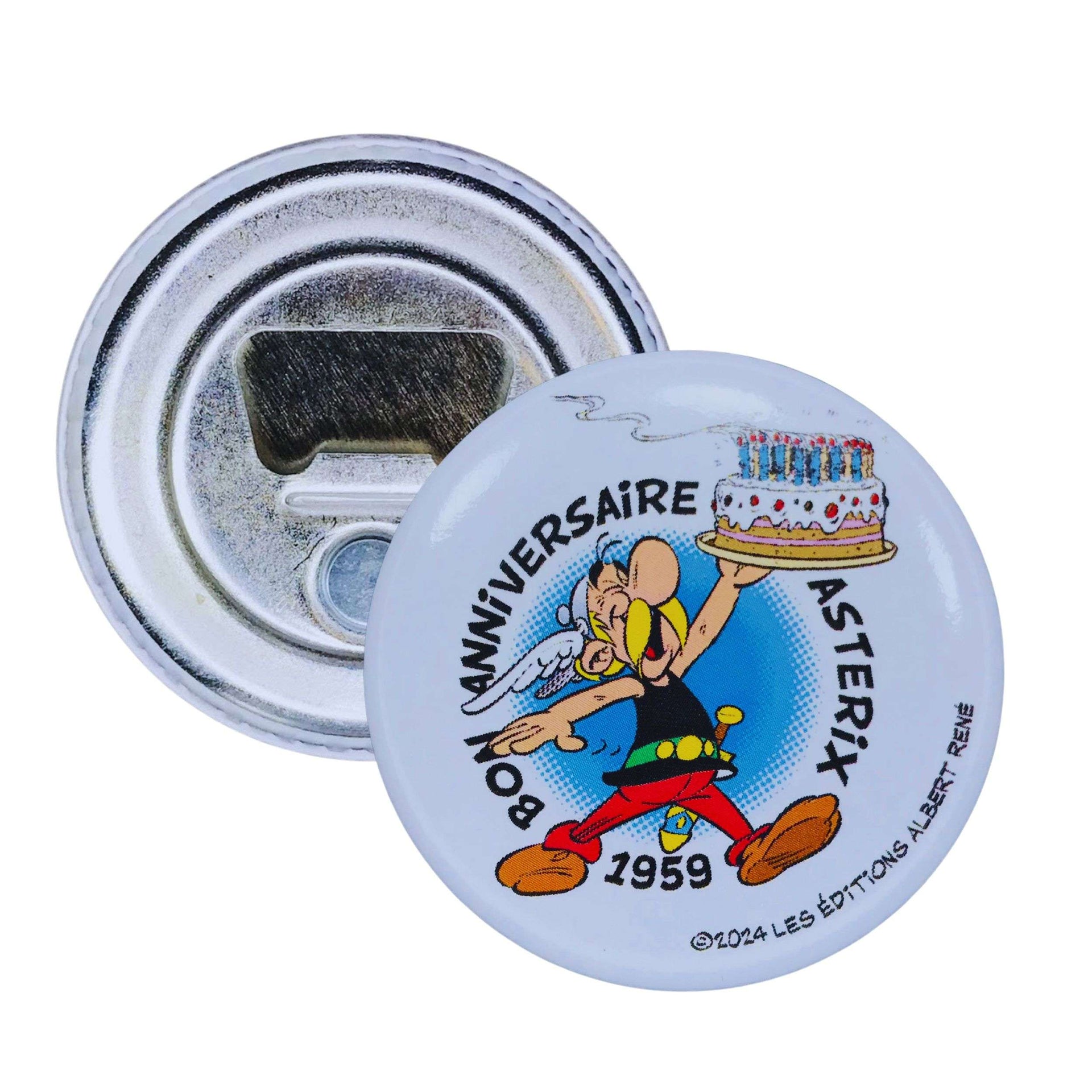 El diseño colorido y detallado representa a Astérix acompañado de una tarta festiva, símbolo de los 65 años repletos de aventuras y emociones. Este detalle artístico hace que el producto no solo sea funcional, sino que también se convierta en un elemento decorativo que se destaca en cualquier superficie metálica, gracias a su potente imán integrado. Perfecto para refrigeradores, pizarras magnéticas o cualquier lugar donde desees añadir un toque de personalidad y diversión, este abrebotellas-imán es un must para coleccionistas y amantes del cómic.