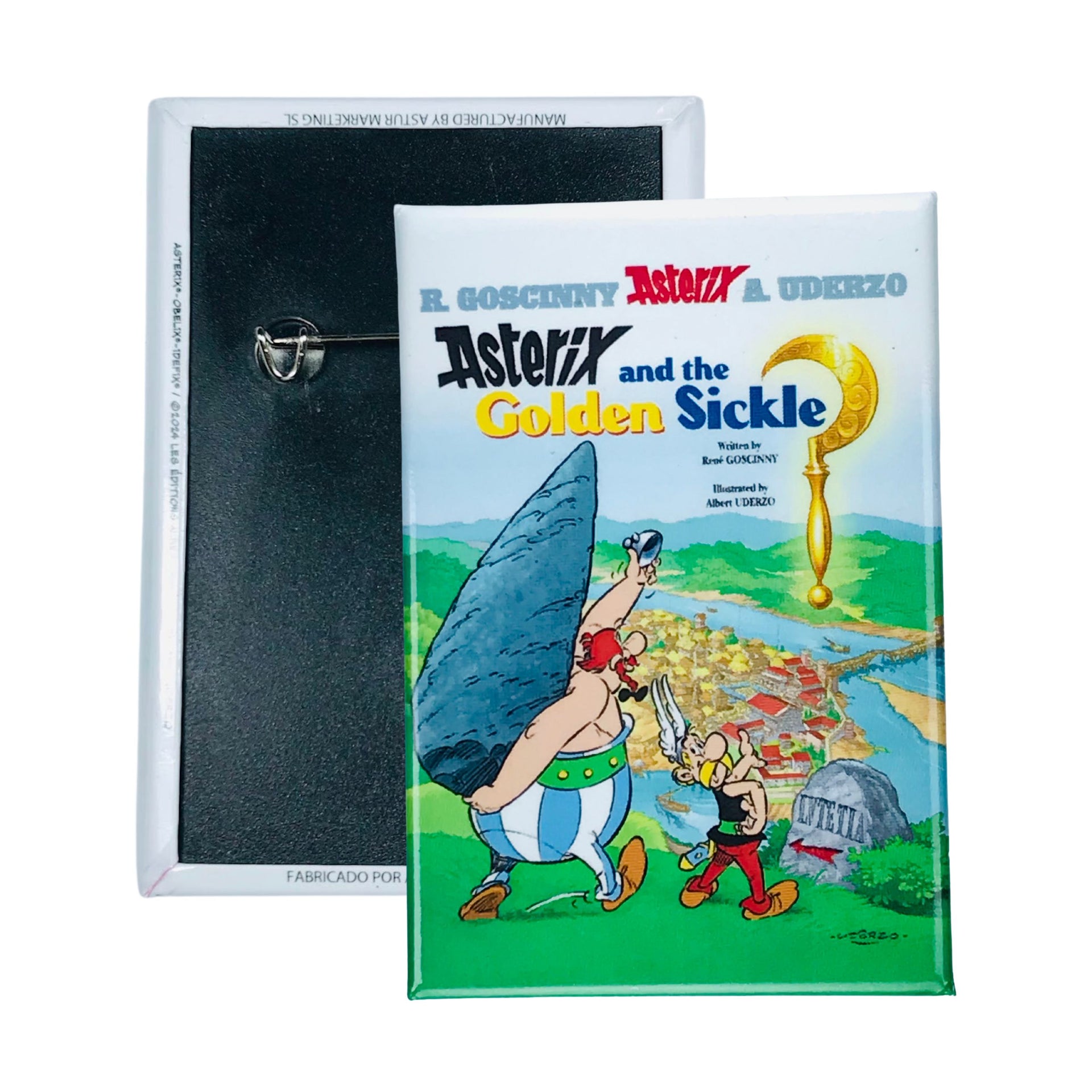 Esta chapa no es un simple accesorio; es un tributo visual que evoca la magia y el carácter irreverente de los protagonistas, invitándote a viajar en el tiempo hasta la época de las épicas batallas contra los romanos, donde la astucia y la camaradería son las armas más poderosas. Su diseño vibrante y fiel a la portada original en inglés del cómic "Asterix and the Golden Sickle" logra capturar cada detalle con precisión, transportando a fanáticos y coleccionistas a los momentos más memorables de esta historia.
